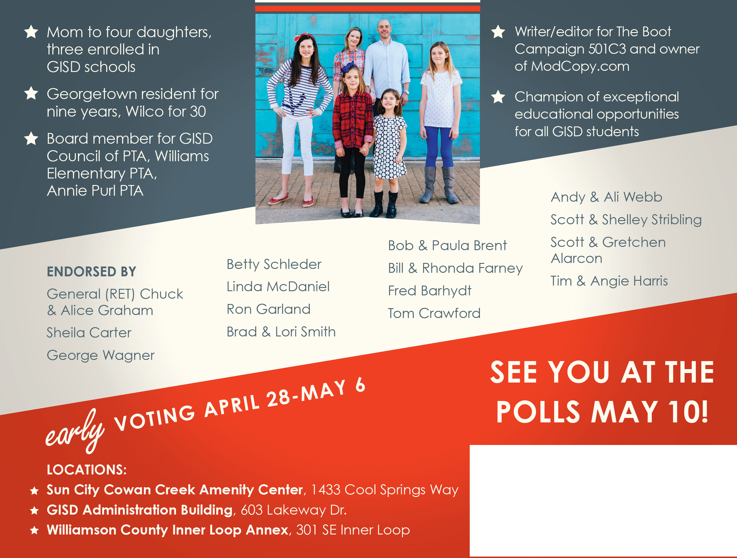 Campaign material for incumbent GISD School Member Place 5. Effective. She won the election by a landslide.